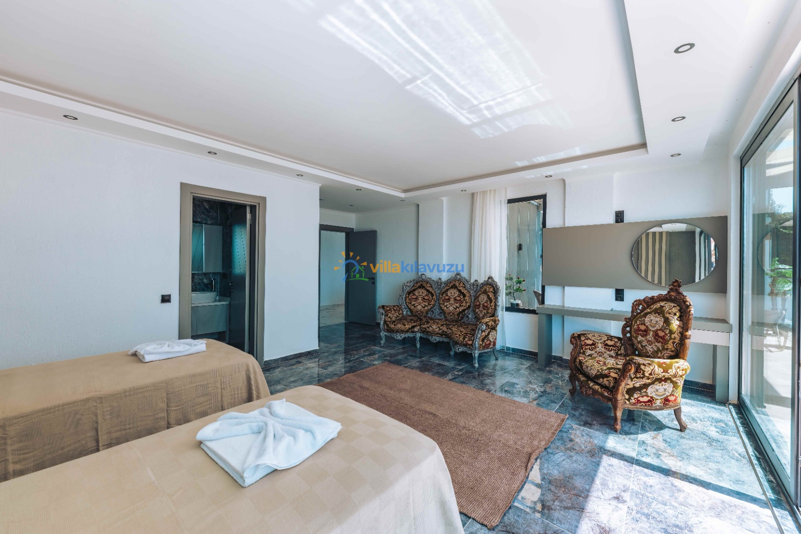 -Villamız 3 yatak odasına sahip olup 6 kişilik konaklama kapasitesine sahiptir.